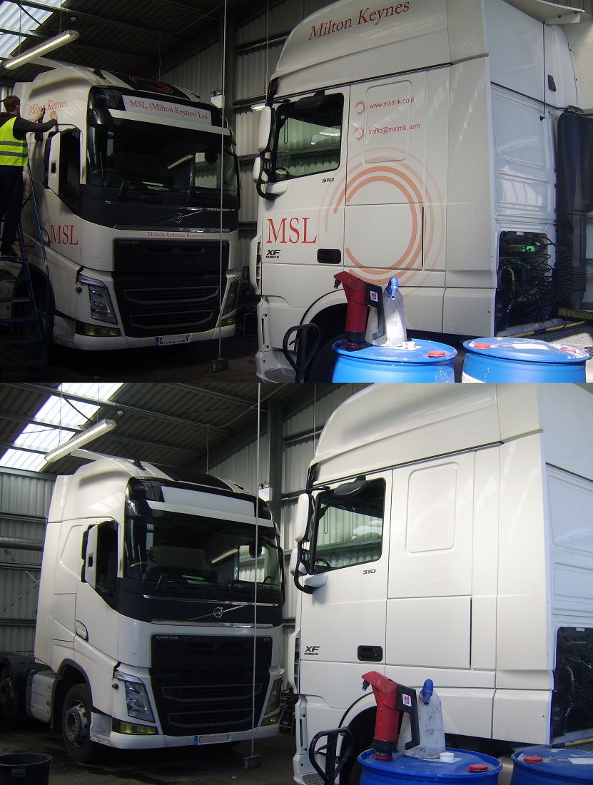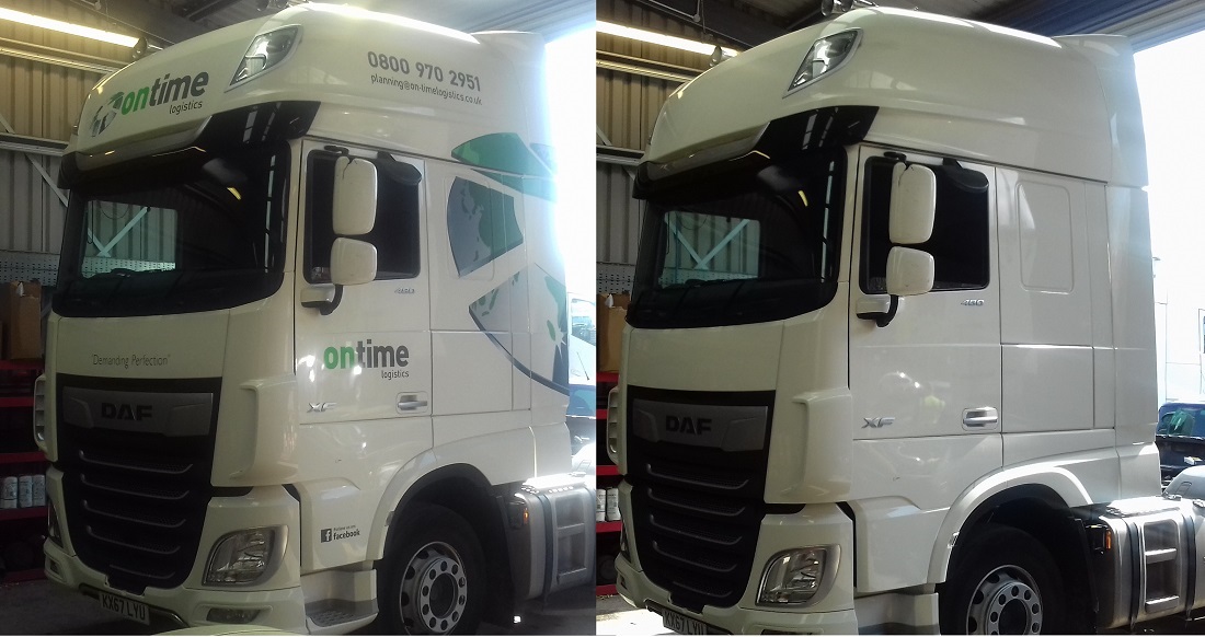 Vinyl graphics and glue removal to two HGV Tractor units, UK.