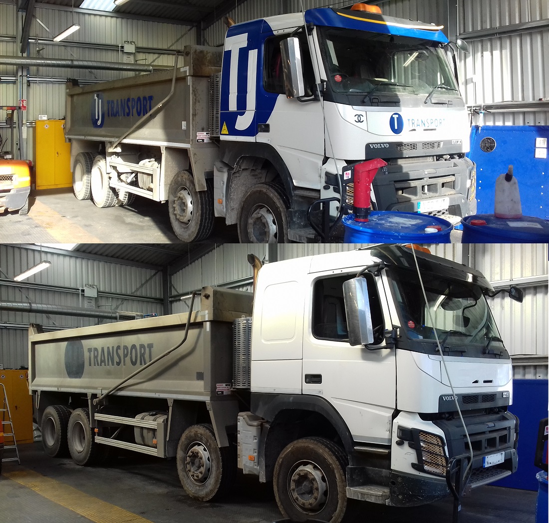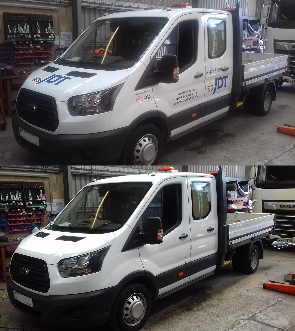 Vinyl decal removal and glue with finishing polish to one of two Ford Tipper Trucks, UK