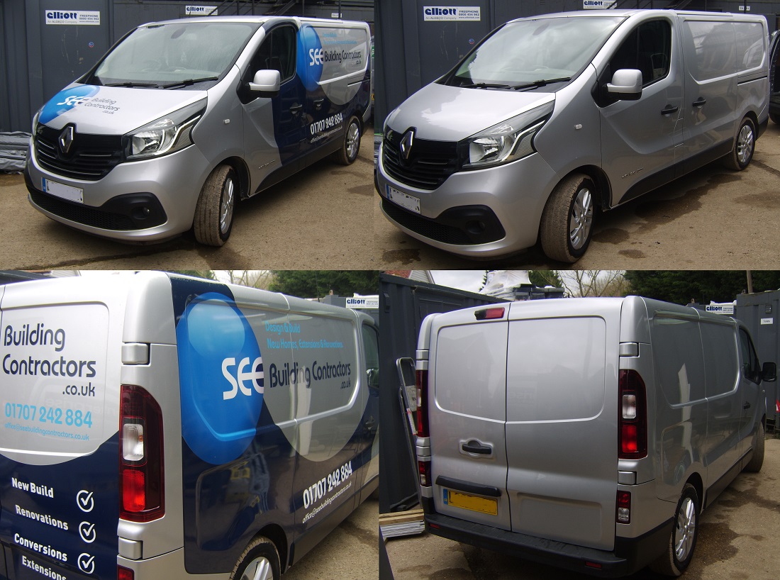 Part vinyl wrap, graphics, glue removal and finishing polish to Renaul Traffic in Hertfordshire.